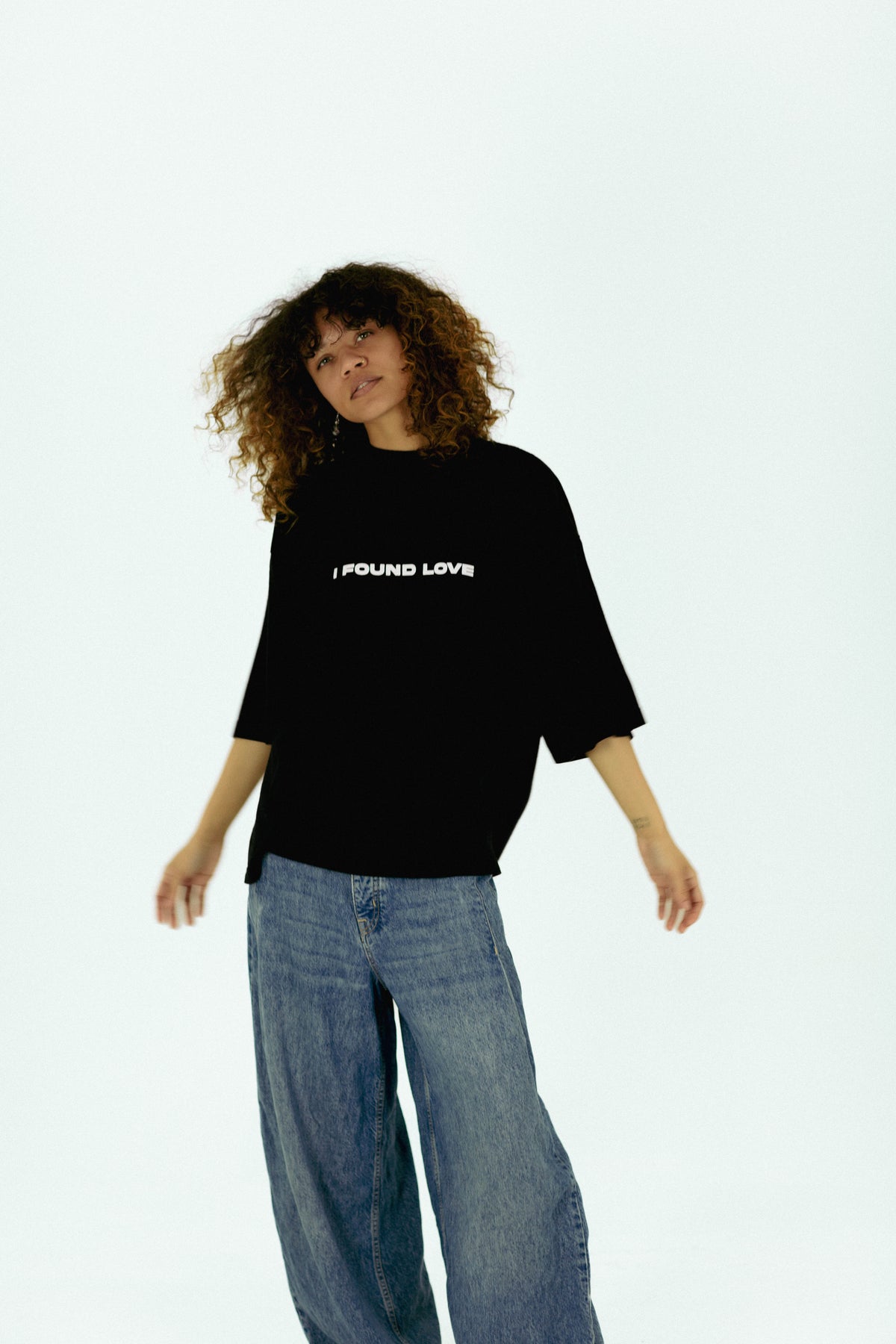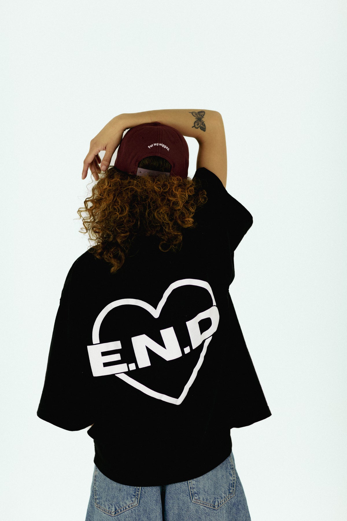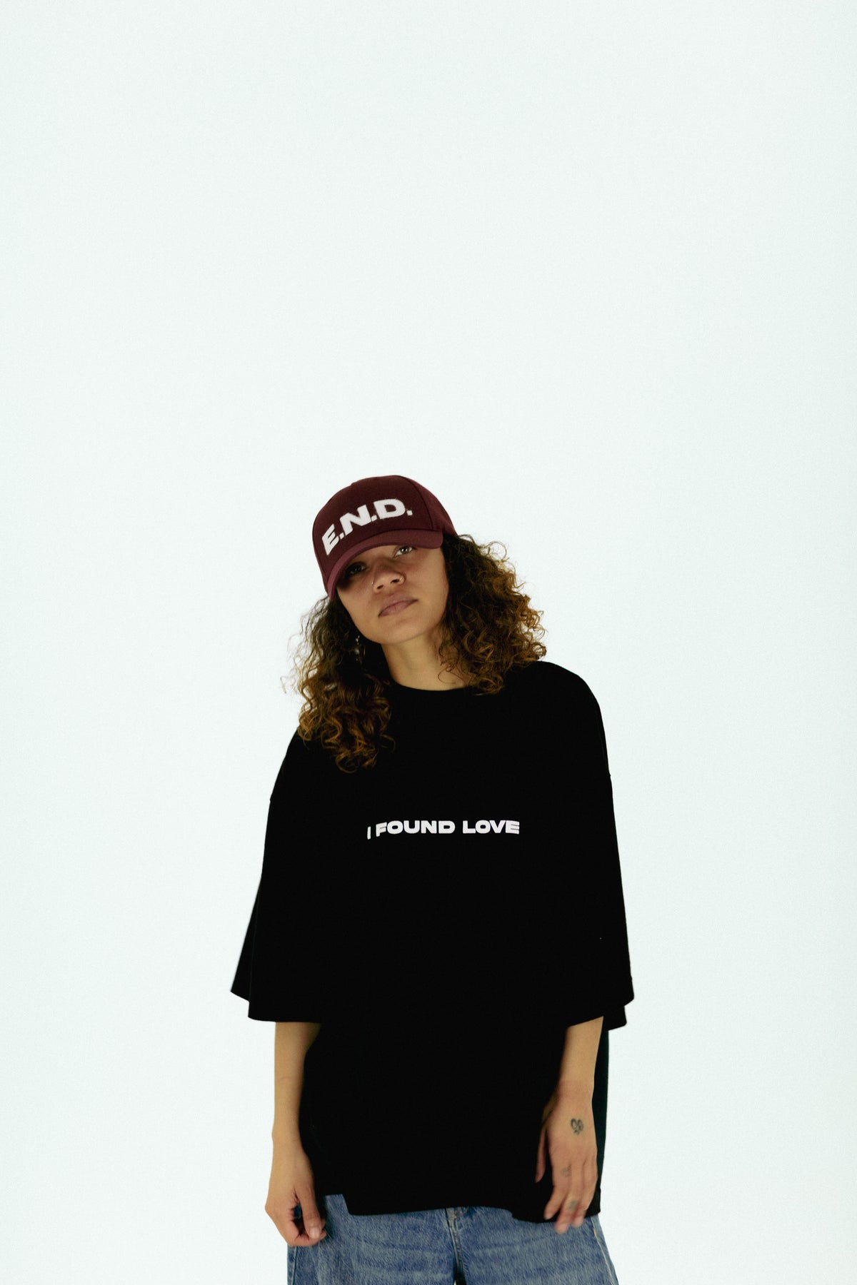 100% COTTON - Oversized fit Cropped length with "I Found Love" over center T with oversized E.N.D. Heart on the back.
